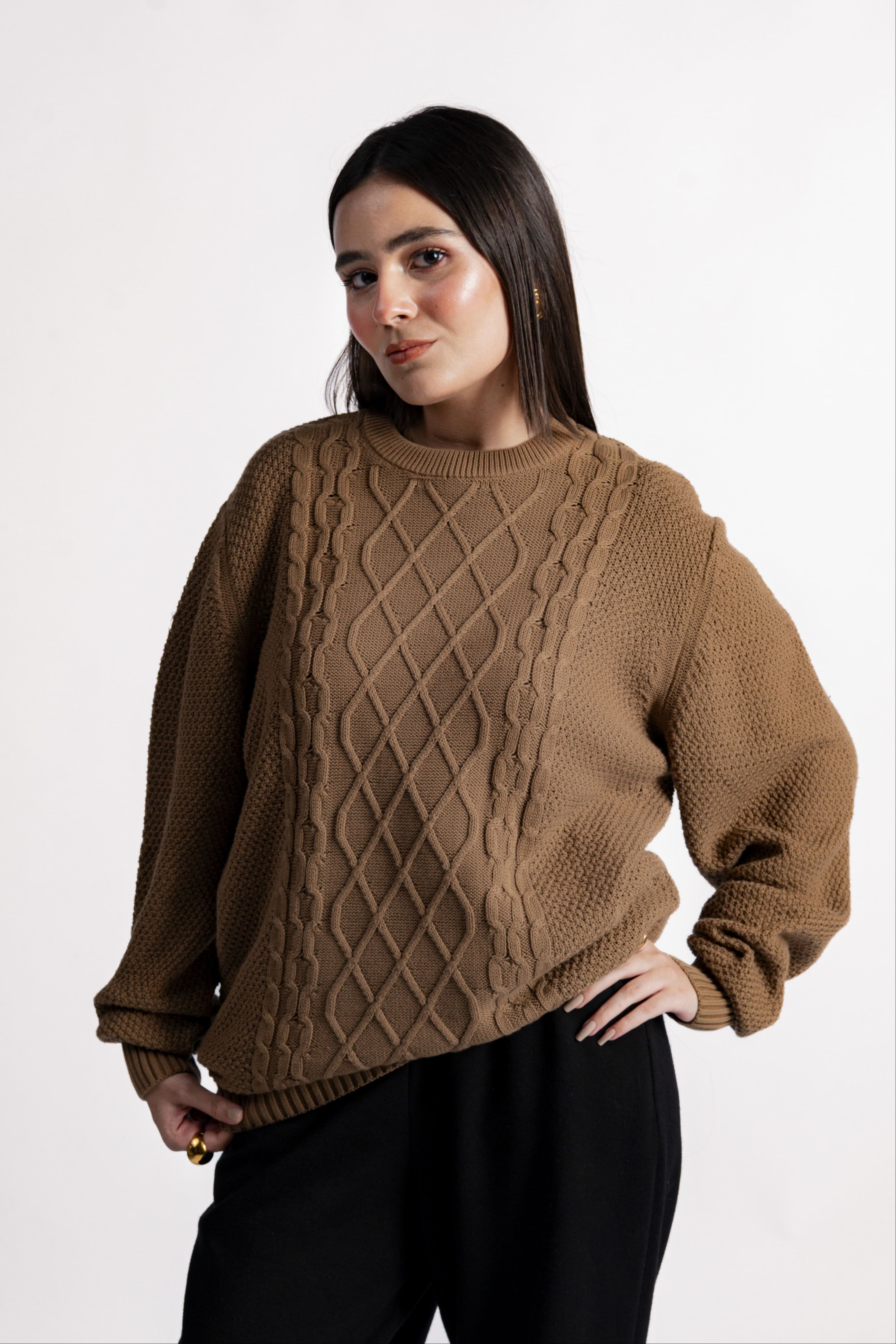The Long Sleeve Aran Knit Jumper features a regular fit with a classic aran stitch pattern and crew neckline. In a deep dark taupe color, its long sleeves make it a straightforward choice for everyday layering.