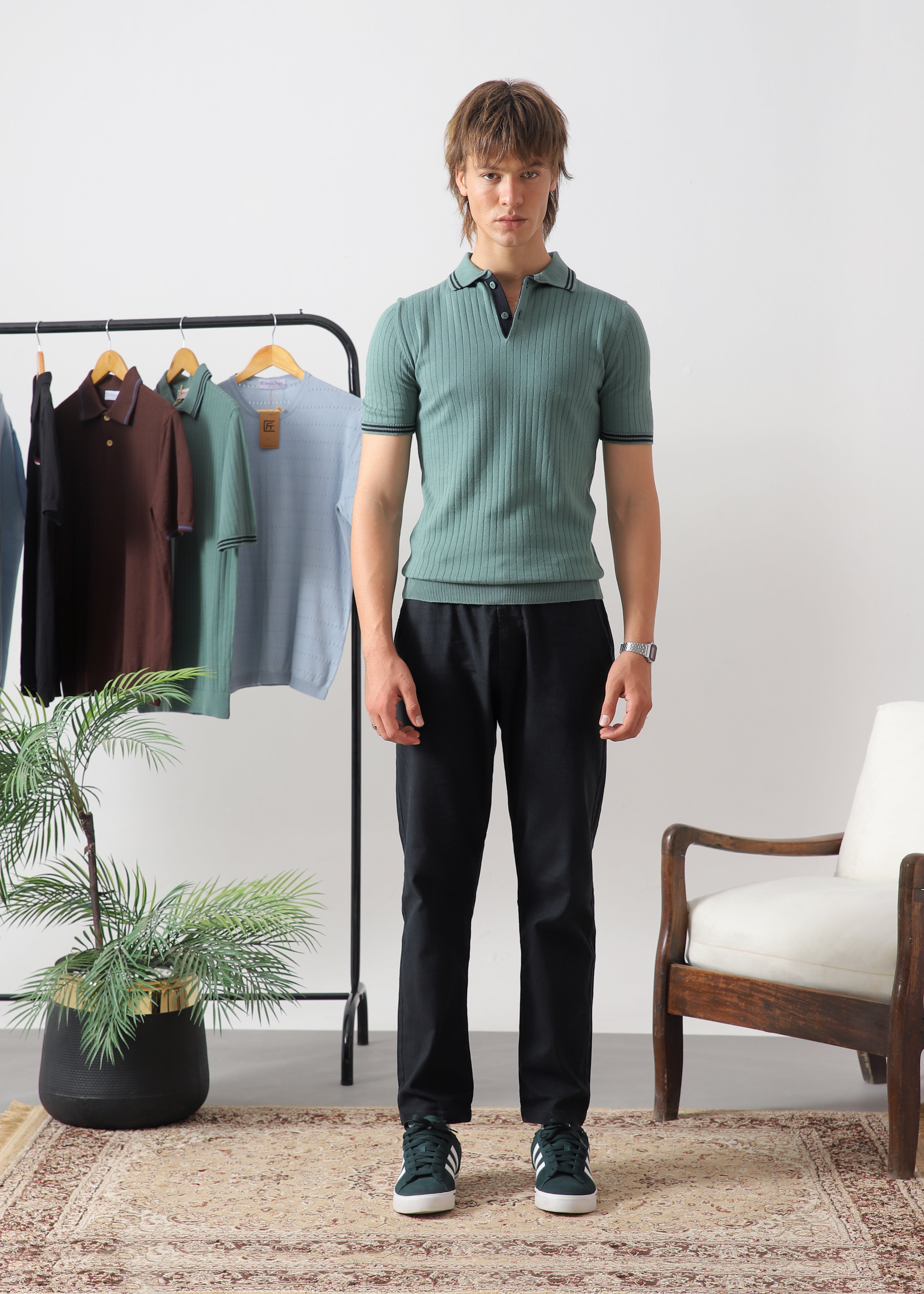 The Muted Teal Drop Needle Polo features a subtle, calming color with a drop needle stitch pattern that promotes airflow. This polo is suited for those who prefer understated tones while keeping cool during summer.