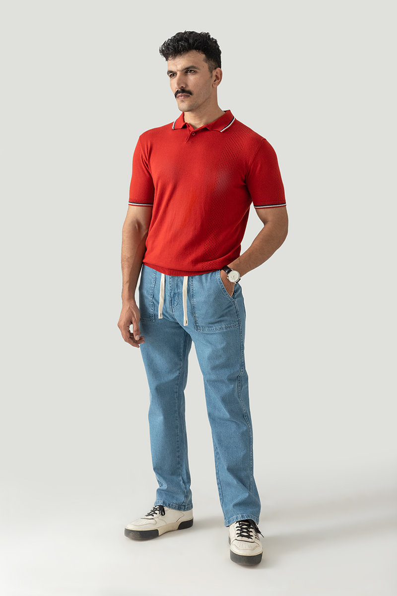 The Pointelle Knit Polo features delicate pointelle detailing that adds sophistication. Made from soft blended cotton, this polo is breathable and perfect for warm days or layered looks. The contrasting blue & white tipping on the collar and sleeves adds a stylish accent to this polo, enhancing its overall appeal.