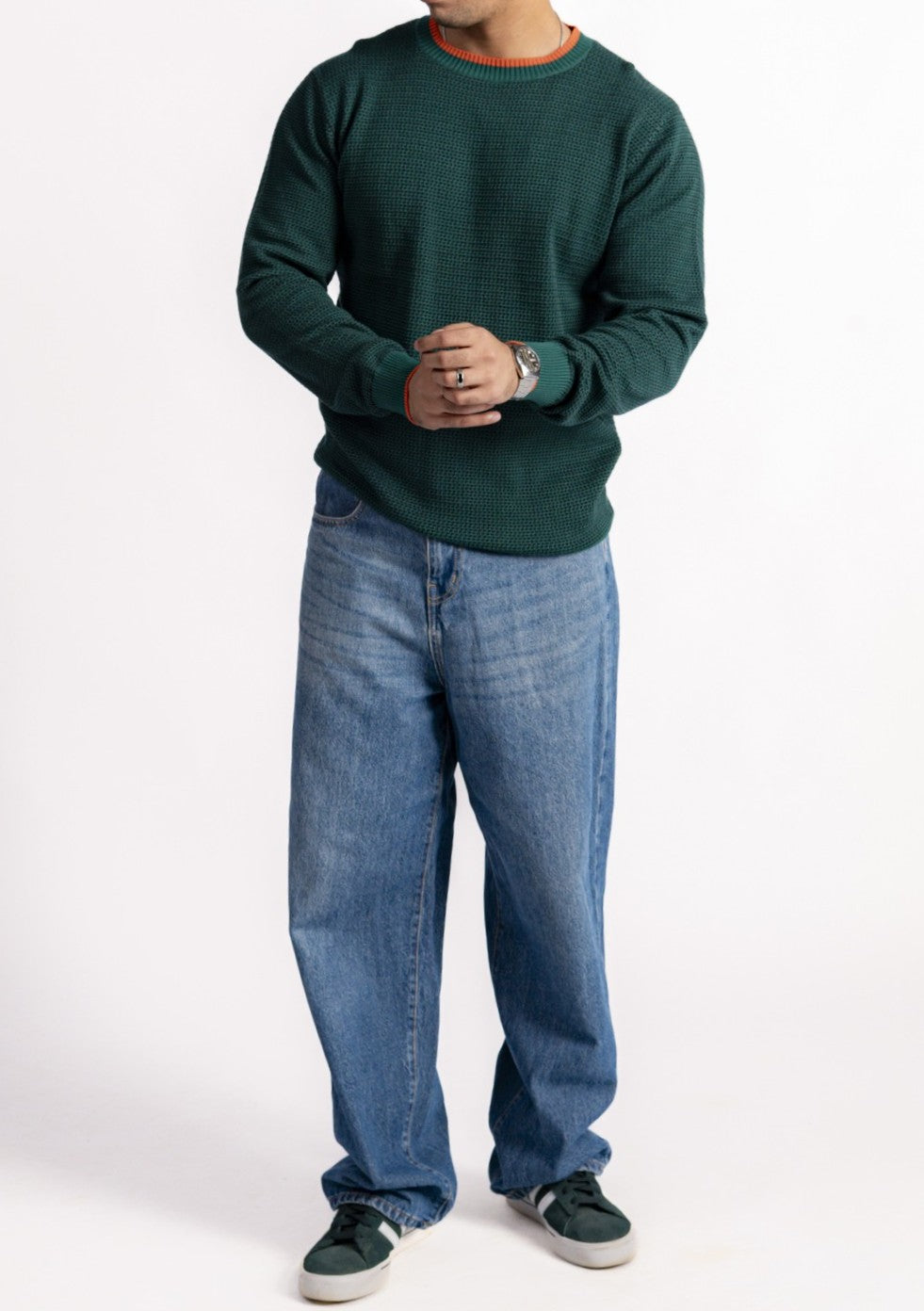 The Timber Green Shaker Knit Jumper features a regular fit with a distinctive shaker stitch that builds a bumpy, tactile texture across the body and long sleeves. Its crew neckline frames a clean silhouette in a deep timber green shade, offering a grounded, nature-inspired option for layering over shirts or pairing with earth-toned bottoms.